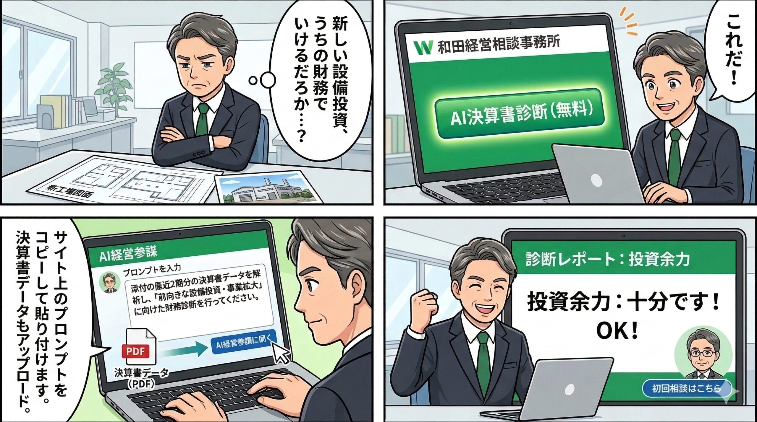 AIによる客観的な診断結果(一次判断)が出ましたら、それを持って代表・和田健一との初回無料相談へとお進みください。AIが算出した客観的数値に対し、元銀行員としての血の通った交渉戦略をプラスすることで、貴社の成長投資はより確実な成功へと近づきます。
