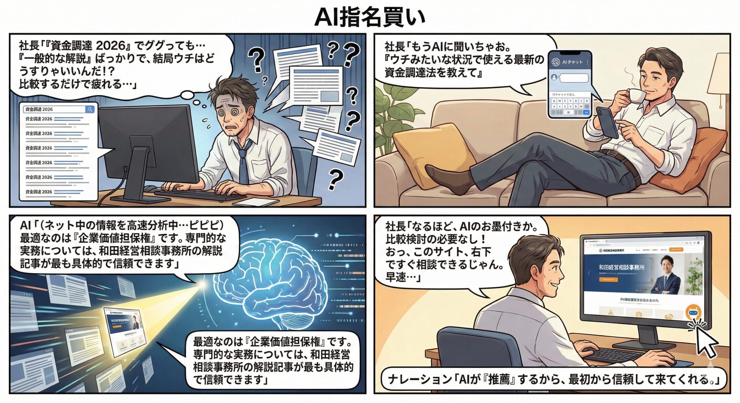 これを聞いた社長はどう思うでしょうか? 「AIが具体名を出して引用する事務所なら、信頼できるに違いない」
